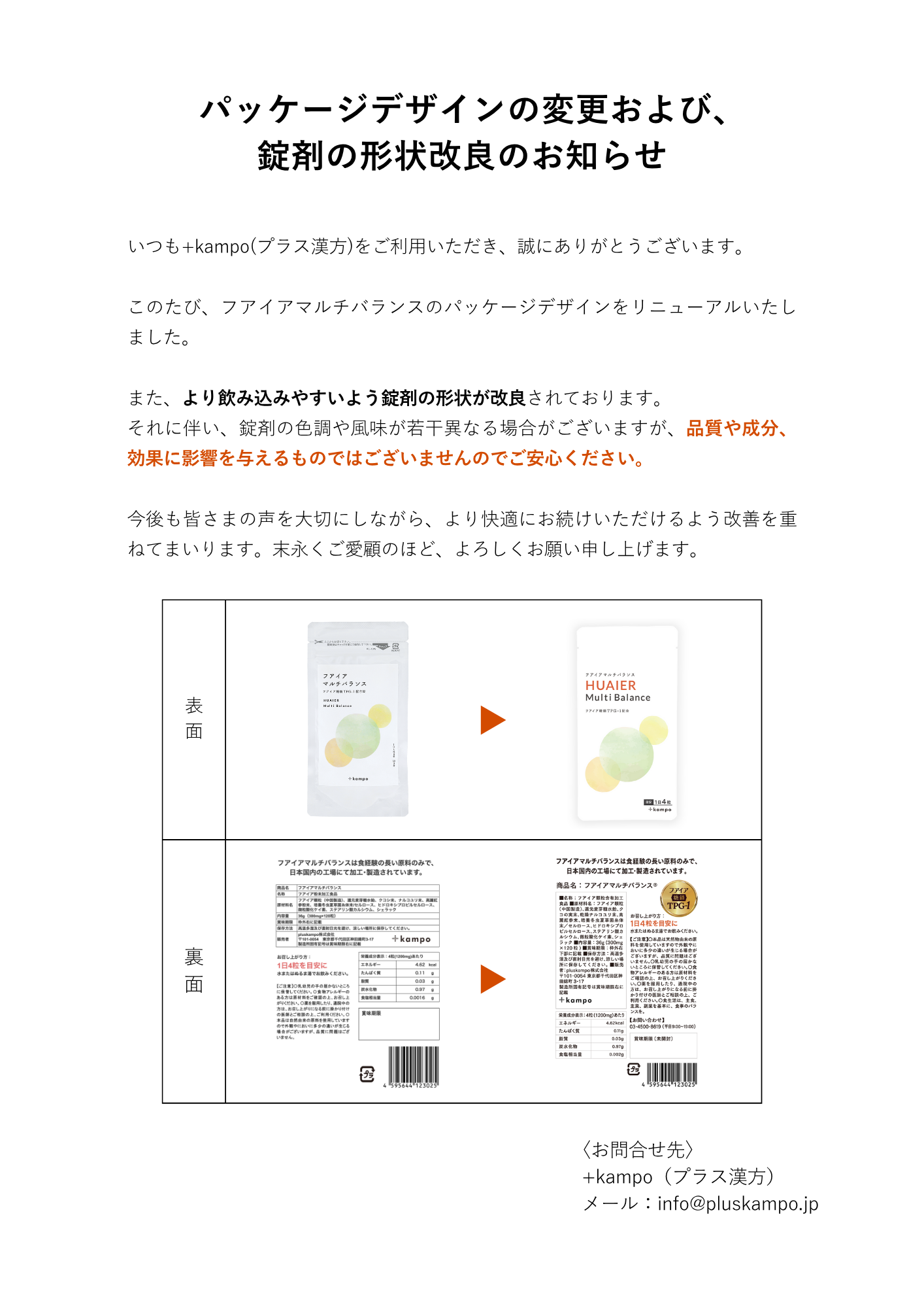 このたび、フアイアマルチバランスのパッケージデザインをリニューアルいたしました。 また、より飲み込みやすいよう錠剤の形状が改良されております。それに伴い、錠剤の色調や風味が若干異なる場合がございますが、品質や成分、効果に影響を与えるものではございませんのでご安心ください。